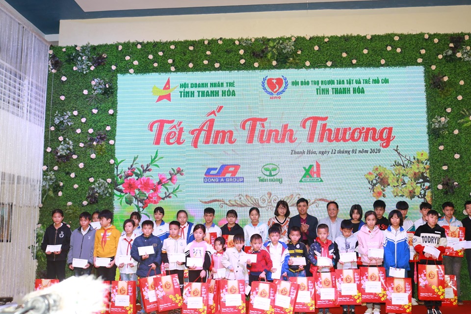 Ngày 12/01/2020, Hội Doanh nhân trẻ tỉnh Thanh Hóa phối hợp với Hội Bảo trợ người tàn tật và trẻ mồ côi tỉnh Thanh Hóa tổ chức chương trình “Tết ấm tình thương” cho các cháu mồ côi, có hoàn cảnh đặc biệt khó khăn trên địa bàn tỉnh Thanh Hóa. Tham dự chương trình, có anh Nguyễn Hồng Phong, Phó Chủ tịch Hội Doanh nhân trẻ Việt Nam; anh Nguyễn Xuân Hưng, Chủ tịch Hội Doanh nhân trẻ tỉnh Thanh Hóa; các đồng chí Thường trực Hội Bảo trợ người tàn tật và trẻ mồ côi tỉnh Thanh Hóa; các anh Thường trực Hội Doanh nhân trẻ, lãnh đạo Công ty Cổ phần Nông nghiệp Hiện Đại Tiến Nông, lãnh đạo Công ty Cổ phần Tập đoàn Đông Á cùng hơn 125 trẻ mồ côi, có hoàn cảnh đặc biệt khó khăn ở khắp các địa phương trên địa bàn tỉnh Thanh Hóa. Hiện nay, toàn tỉnh Thanh Hóa có hơn 20.000 trẻ mồ côi, có hoàn cảnh đặc biệt khó khăn; nhằm bảo đảm an sinh xã hội, góp phần chung sức để các cháu được tới trường, hướng tới một tương lai tốt đẹp; hưởng ứng phát động của Trung ương Hội Doanh nhân trẻ Việt Nam tại Lễ ký kết giữa Hội Bảo trợ người khuyết tật và trẻ mồ côi Việt Nam và Hội Doanh nhân trẻ Việt Nam trong đó Doanh nhân trẻ Việt Nam phấn đấu nhận đỡ đầu cho 1.000 trẻ mồ côi có hoàn cảnh đặc biệt khó khăn và hỗ trợ, đỡ đầu cho các dự án khởi nghiệp của thanh niên khuyết tật.