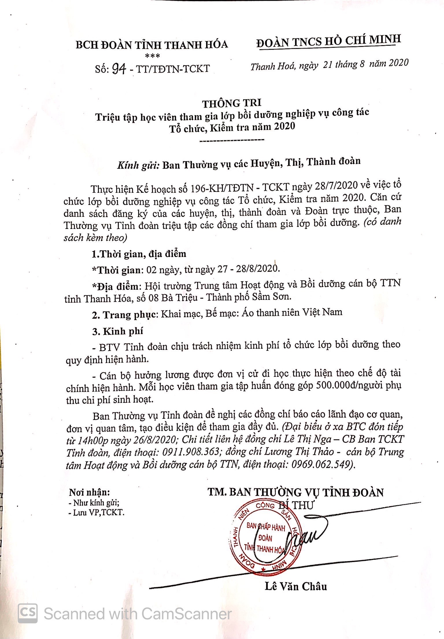 | Trích yếu | THÔNG TRI Triệu tập học viên tham gia lớp bồi dưỡng nghiệp vụ công tác Tổ chức, Kiểm tra năm 2020 |